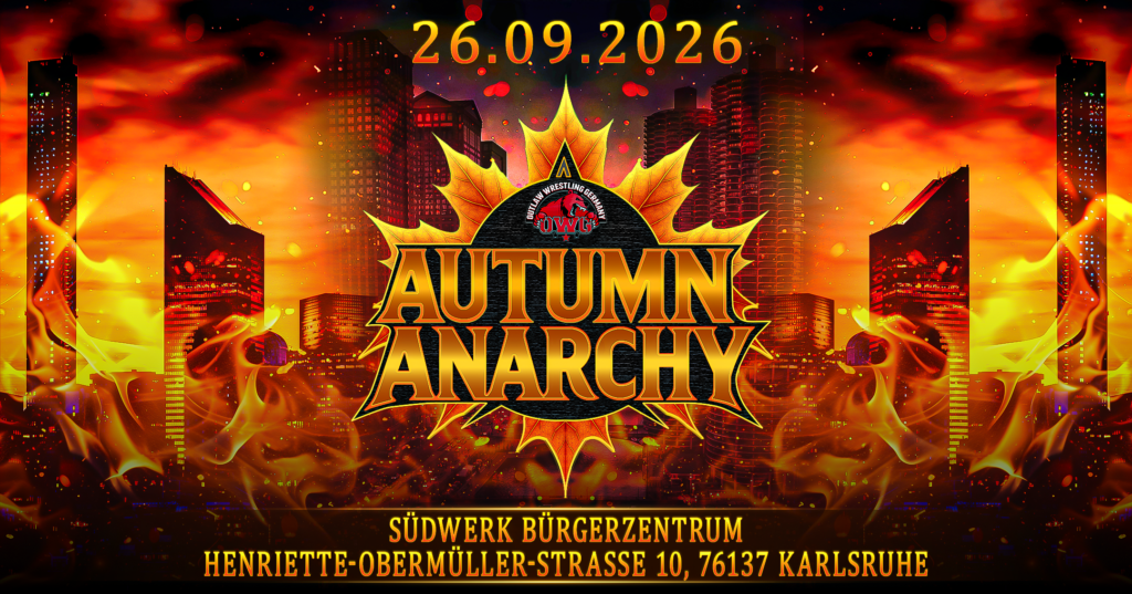 WRESTLING LIVE EVENTS TICKETS DIE LIVE TOUR 2026 OWG Breakout21. Februar Strudelbachhalle Flachter Str. 60, 71287 Weissach OWGMai 2026TBA OWG Autumn Anarchy26. September Südwerk Bügerzentrum Henriette-Obermüller-Str. 10, 76137 Karlsruhe OWG Wrestle War 202612. DezemberEnztalhalle CalmbachMörikestr. 12, 75323 Bad Wildbad
